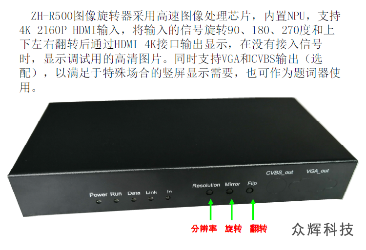 此款為ZH-R400的升級(jí)高端版本ZH-R500,此版本為全新發(fā)售,Linux嵌入式系統(tǒng),支持NPU,全按鍵操作,自動(dòng)記憶,自帶測(cè)試底圖,沒(méi)有信號(hào)接入時(shí)也可以調(diào)試,輸入輸出分辨率可以設(shè)置為1080P和2160P。支持上下左右鏡像,可做為題詞器使用。彌補(bǔ)之前版本分辨率低,顯示文字不清楚的問(wèn)題,如果對(duì)顯示要求不高,價(jià)絡(luò)敏感的用戶也可以選擇ZH-R100 如果輸入不要求4K,可能選擇1080P輸入的ZH-R400,如果喜歡安卓系統(tǒng)可以選擇ZH-R300。